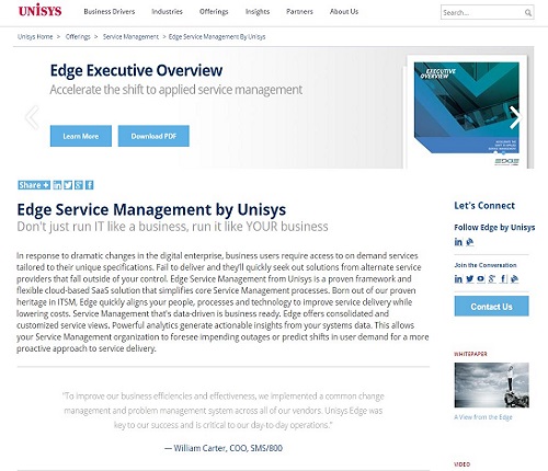 Construida con estándares y normas de la Information Technology Infrastructure Library (ITIL), Edge permite a los clientes modernizar los sistemas de service desk legados e implementar una solución integrada, en conformidad con el estándar ITIL v3 y listo para apoyar a la escala de negocios de forma rápida en Microsoft Azure.