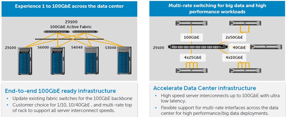 El ingreso inicial de Dell en este mercado es el switch Z9100. El Z9100 es un switch de factor forma fijo de 1RU con 32 puertos 100G, 64 de 50G, 32 de 40G, 128 de 25G o 128 + 2 puertos de 10G que usan un cable de breakout. El switch se encuentra diseñado para las capas de agregación y de acceso en una red de centro de datos.