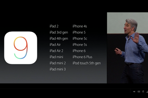 Estas funciones estarán disponible sólo para los iPads de los últimos dos años (Air, Air 2, Mini 2 y Mini 3, salvo SplitScreen que estará sólo para el Air 2). iOS 9 será compatible con los mismos equipos que iOS 8, es decir, desde el iPhone 4s en adelante. La descarga también será más liviana, pasando desde los más de 4 GB de iOS 8 a 1,3 GB de iOS 9.