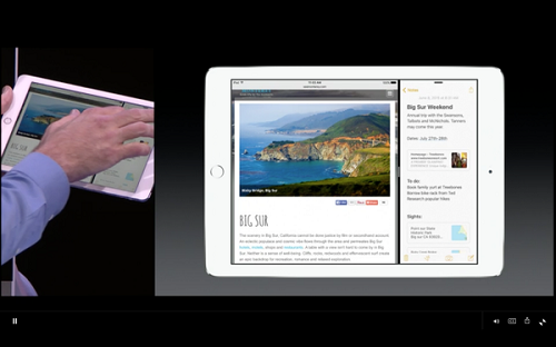 iOS 9 también trae importantes cambios en el iPad, sumando una característica pedida por los usuarios desde hace años: la opción de correr dos aplicaciones al mismo tiempo en la pantalla. Lo hace en tres versiones distintas: «SlideView», que permite sacar versiones «mini» de algunas apps para ponerlas temporalmente en el display, «SplitScreen», que deja tener dos aplicaciones constantemente en la pantalla y finalmente «Picture in Picture», que deja una ventana de video corriendo sobre el resto del sistema operativo.