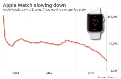 Las ventas del Apple Watch habrían caído un 90 por ciento en Estados Unidos desde la semana de lanzamiento, de acuerdo con un informe de investigación de mercado. Una fuerte caída desde la semana de apertura del 10 de abril cuando se vendieron 1,5 millones de unidades agotando existencias en algunos mercados.