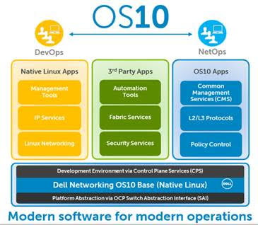 - Módulos de Aplicación OS10 – En la parte superior del módulo base el software OS10 puede soportar funcionalidades tradicionales de red de Dell (Protocolos L2 y L3)así como numerosas aplicaciones de terceros, nativas en Linux, y de código abierto como IP, servicios de fabric y de seguridad combinados con herramientas de administración y automatización. Esto le permite a los clientes adaptar sus operaciones de TI para diferentes casos de uso y procesos operativos.