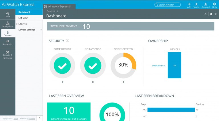 Según VMware, AirWatch Express es muy fácil de usar, no exige conocimientos técnicos o tener más empleados de TI y permite a las empresas soportar una plantilla cada vez más móvil. Las empresas con departamentos de TI más pequeños o sin ningún departamento informático, tienen las mismas necesidades básicas móviles que las empresas grandes y AirWatch Express es una solución asequible e intuitiva que no requiere configuraciones ni formaciones extensas. La solución basada en la nube ofrece una experiencia de gestión de móviles intuitiva y está disponible para iOS, macOS, Android y Windows 10.