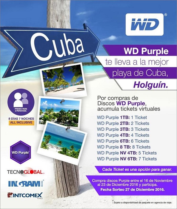 Desde este miércoles 16 de noviembre y hasta el sábado 23 de diciembre, todas las compras de WD Purple realizadas en los mayoristas autorizados, acumulan tickets virtuales. Cuanta más capacidad se adquiera, más tickets virtuales se suman.