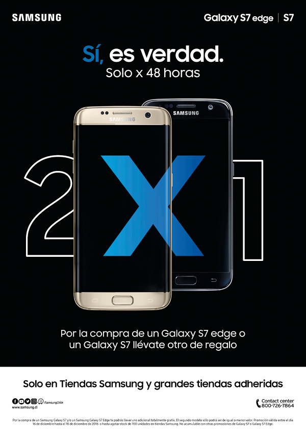 Samsung Chile acaba de lanzar una campaña en sus puntos de venta y tiendas adheridas, de 2×1 en la compra de su modelo Galaxy S7 edge y S7 por 48 horas en Chile.