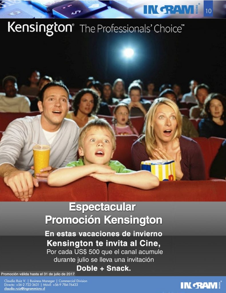 De acuerdo a los términos de esta oferta, por cada USD$500 que el canal acumule hasta el 31 de julio, Kensington regalará una entrada doble al cine más los dos snacks correspondientes.