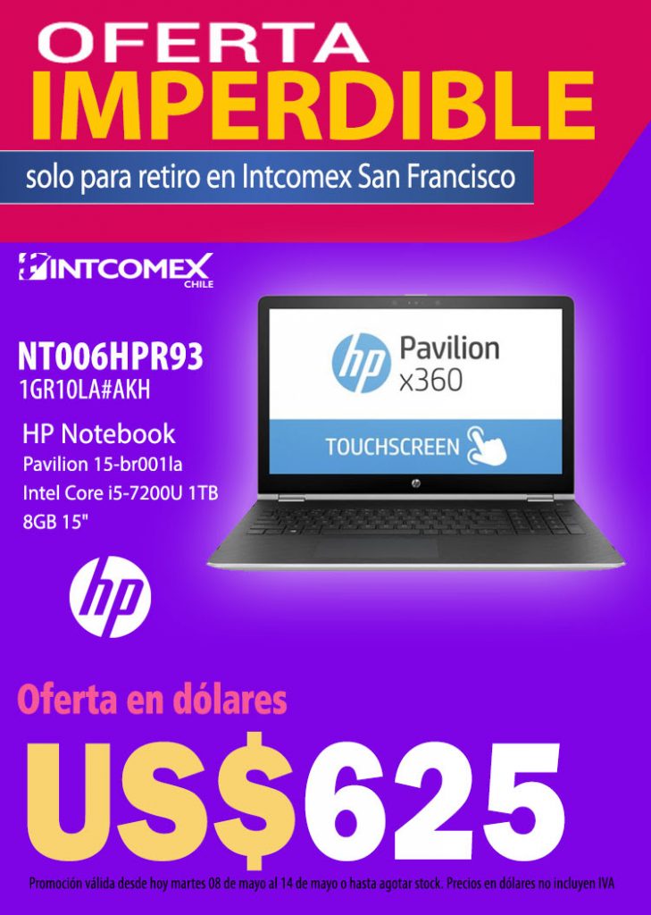 Los clientes de Intcomex pueden encontrar el exitoso Notebook HP Pavilion X360 15-br001 lA, con un procesador Intel Core i5-7200U, 1TB de almacenamiento, 8GB de ram y una pantalla 15” donde podrá disfrutar de películas y fotos con la excelente calidad de imagen y el detalle de alta definición de 1 millón de píxeles, a un precio oferta irrepetible de US$ 625 + IVA.