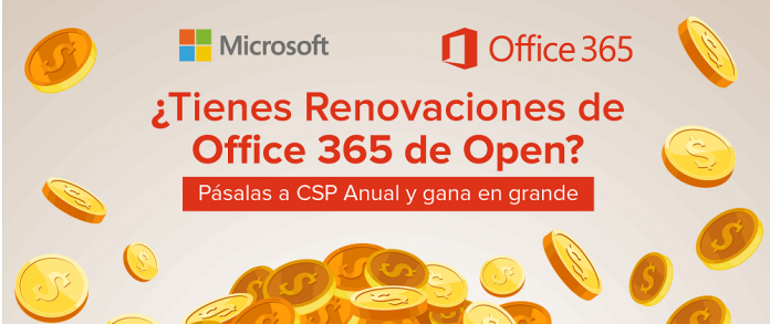 La promoción es válida sólo para renovaciones de Open a CSP asociando el tenant, e incluye Office 365 Business, Business Premium, Enterprise E1, E3, E5, Exchange Online Plan 1 y 2, Project y Visio.