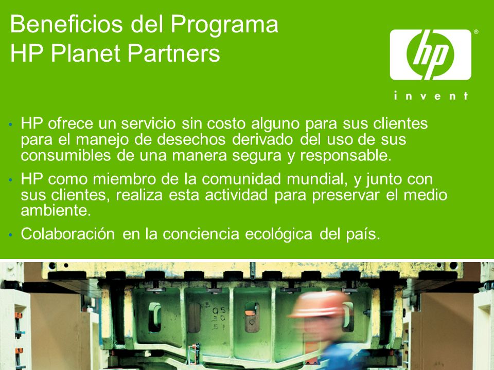 “HP y su Programa HP Planet Partners” continúa su trabajo para fortalecer las condiciones bajo las cuales los humanos y la naturaleza pueden existir en armonía productiva, y así cumplir con los requisitos sociales y económicos de las generaciones presentes y futuras.