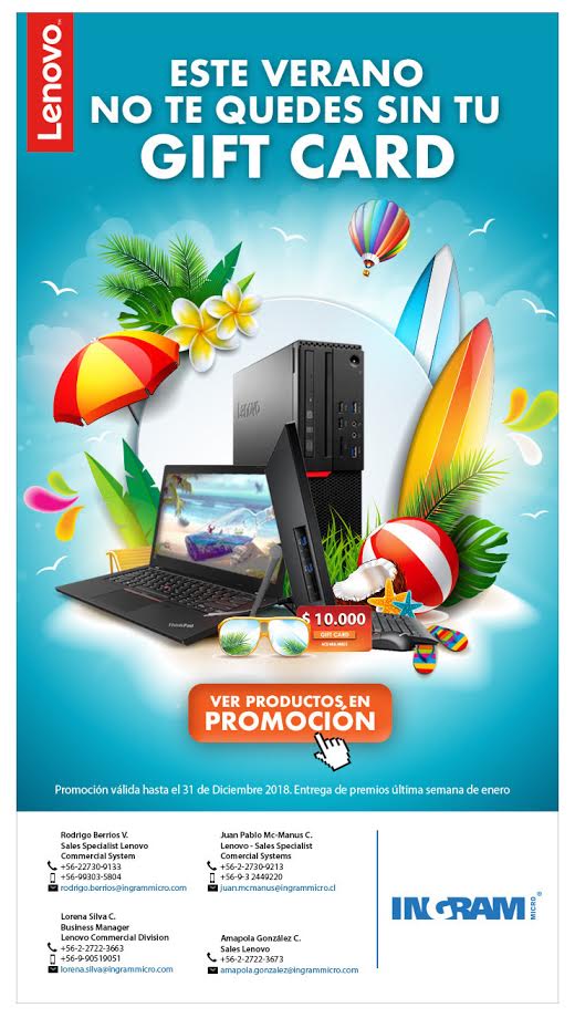 Para mayor información, contacta a tu ejecutivo o al equipo Lenovo en Ingram Micro: Rodrigo Berrios, al email rodrigo.berrios@ingrammicro.com; Juan Pablo Mc-Manus, al email juan.mcmanus@ingrammicro.com; Lorena Silva, al email lorena.silva@ingrammicro,com; y a Amapola González, al email amapola.gonzalez@ingrammicro.com