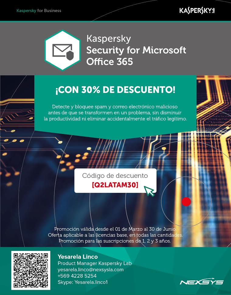 Mayor información sobre las soluciones de Kaspersky Lab disponibles en Nexsys contactando a Yesarela Linco, Product Manager de la marca en el mayorista, al email yesarela.linco@nexsysla.com o al teléfono +569 42285254.