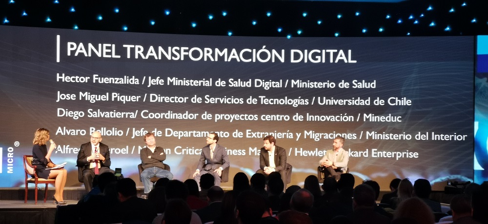 Posteriormente se realizó el Panel de Transformación Digital, compuesto por Héctor Fuenzalida, Jefe Ministerial de Salud Digital del Ministerio de Salud; José Miguel Piquer, Director de Servicios de Tecnología de la Universidad de Chile; Diego Salvatierra, Coordinador de Proyectos del Centro de Innovación del Ministerio de Educación; Állvaro Bellolio, Jefe de Departamento de Extranjería y Migraciones del Ministerio del Interior; y Alfredo Villarroel, Mission Critical Business Manager de HP Enterprise.