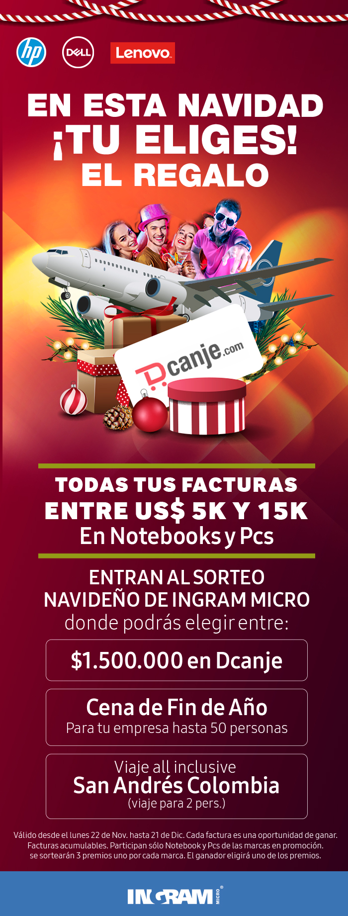 La campaña comienzòel viernes 22 de noviembre, se extiende hasta el próximo 21 de diciembre y considera todas las facturas entre US$5 y 15K en notebooks y PCs de las marcas Dell, HP y Lenovo. Cada factura es una oportunidad para ser uno de los ganadores de este gran sorteo, que regalará 3 premios en total (uno por cada marca).