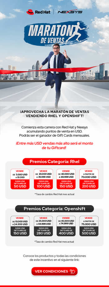 El mayorista de valor agregado junto a su fabricante Red Hat te invitan a seguir participando en su campaña “Maratón de Ventas”, donde los socios del canal pueden ganar giftcards de hasta US$500 por ventas de productos Openshift y RHEL.