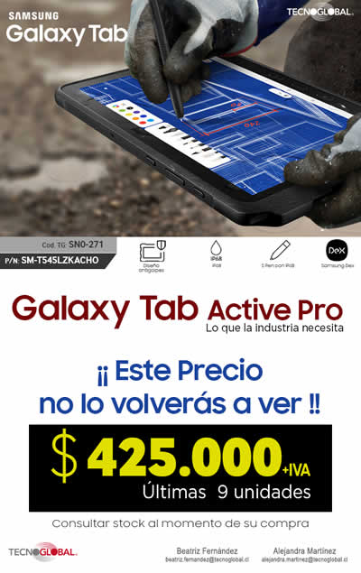 Encuentra este producto a precio oferta de $425.000 más IVA. Pero, apúrate, porque esta promoción es válida hasta agotar stock de 9 unidades. La tablet Galaxy Tab Active Pro tiene el código. (Cód. TG: SN0-271/PN: SM-T545LZKACHO)