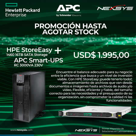 Con el objetivo de entregar atractivas ofertas a sus clientes, elmayorista de valor agregado, junto a sus fabricantes HPE y APC, están ofreciendo el NAS HPE StoreEasy 1460 16TB SATA, más una APC Smart-UPS RC 3000VA 230V (incluye kit de rieles) a un precio increíble.