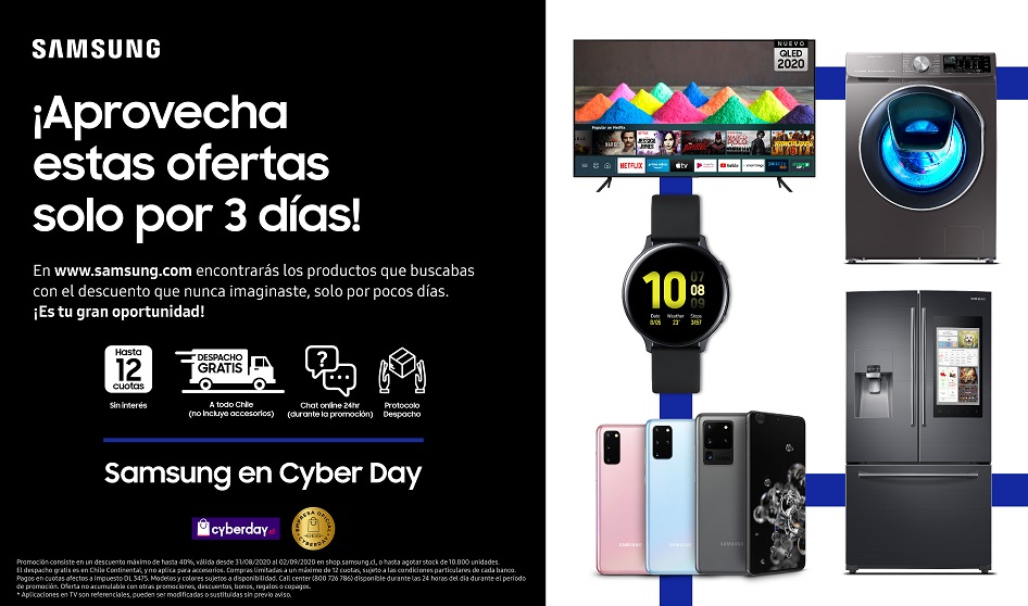 Cabe destacar que, la mayoría de los equipos Samsung contarán con despacho gratis a todo Chile -excepto accesorios-, bajo medidas de entrega segura y podrán comprarse con hasta 12 cuotas sin interés con todas las tarjetas bancarias. Adicionalmente, y mientras dure el evento, estará habilitado un soporte en modalidad de chat durante 24 horas.