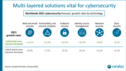 Canalys prevé que la seguridad de la web y el correo electrónico crecerá un 12,5% en el 2021, uno de los segmentos de mayor crecimiento, ya que tecnologías dispares convergen para asegurar las conexiones persistentes entre los usuarios y los servicios en la nube. La analítica de vulnerabilidad y seguridad aumentará un 11,0%, expandiéndose más allá del registro y la monitorización hacia la inteligencia de amenazas, el análisis del comportamiento y la respuesta automatizada. «El crecimiento de la seguridad de los puntos finales se ralentizará hasta el 10,4% después de un fuerte 2020. Seguirá siendo una parte vital de las pilas de ciberseguridad, ya que muchos trabajadores de oficina siguen trabajando a distancia. La gestión del acceso a la identidad, una parte clave de las políticas de confianza cero, que sustenta el acceso seguro a los datos y las aplicaciones, crecerá un 10,4%. La seguridad de las redes será el mayor segmento, con un aumento del 8,0%, impulsado por la reanudación de los proyectos de actualización retrasados. La seguridad de los datos aumentará un 6,6%, centrándose en la protección, la copia de seguridad y la recuperación, así como en las políticas coherentes en entornos multi-nube e híbridos de TI”, finalizó el analista.