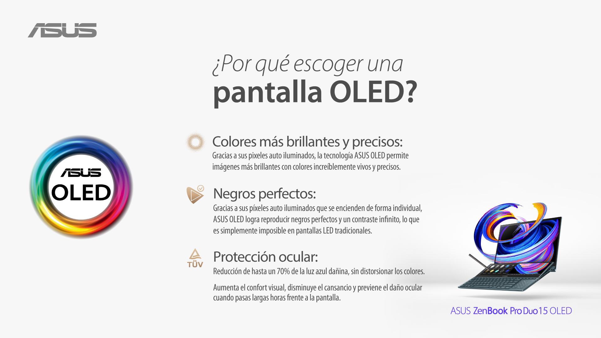 Para mostrar los colores más reales posibles, el ZenBook Pro Duo 15 OLED admite una gama de colores excepcionalmente amplia con una cobertura del 100% de DCI-P3. El espacio de color DCI-P3 -ampliamente utilizado en la industria cinematográfica- es cada vez más la opción preferida de los profesionales creativos por su mayor gama de colores posibles. Todo esto mientras cuida de los ojos debido a que reduce hasta en un 70% la luz azul de acuerdo al certificado TÜV Rheinland.