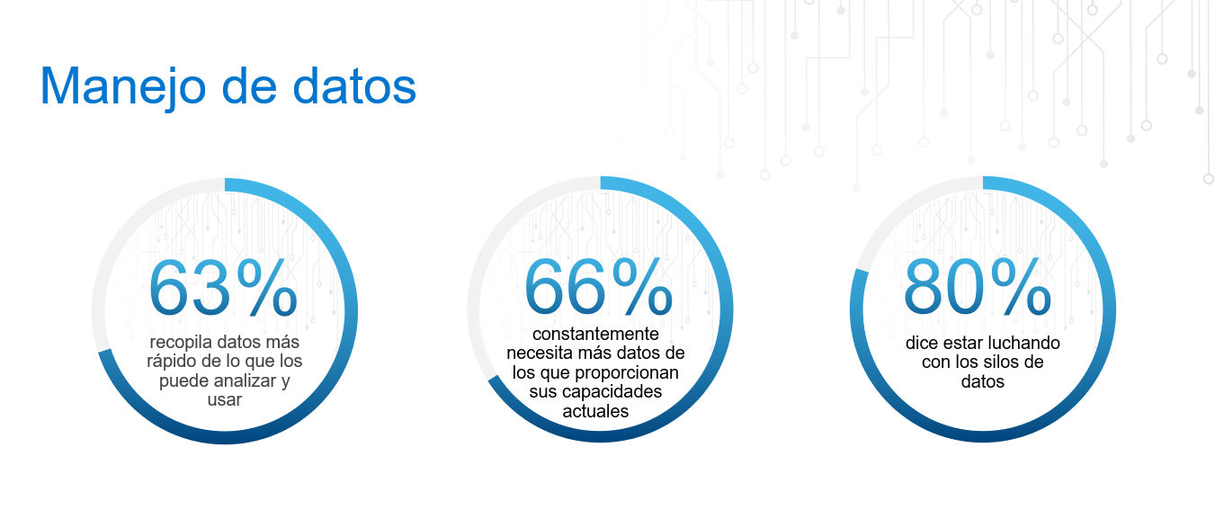 Según la investigación, el 63% dice que recopila datos más rápido de lo que los puede analizar y usar; sin embargo, el 66% asegura que constantemente necesita más datos de los que proporcionan sus capacidades actuales. Esto podría deberse a lo siguiente: