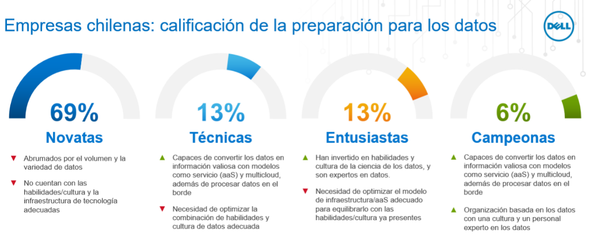 Más de la mitad de los encuestados (el 58%) en Chile asegura que su empresa está impulsada por los datos y que “los datos son la esencia de su organización”. Pero solo el 14% afirma que trata los datos como capital y que prioriza su uso en toda la empresa. 71 empresas chilenas fueron consultadas en el estudio.