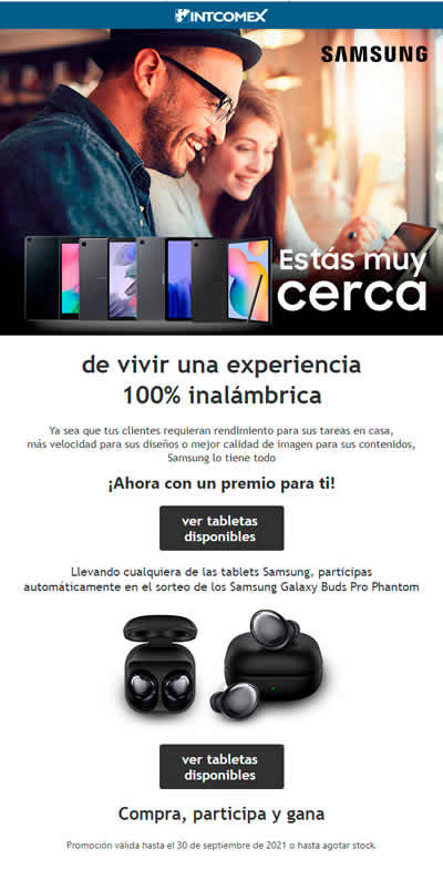 Por la compra de cualquiera de las tablets de la marca en Intcomex, estarás participando automáticamente en el sorteo de un par de Samsung Galaxy Buds Pro Phantom, earbuds con cancelación activa de ruido inteligente.
