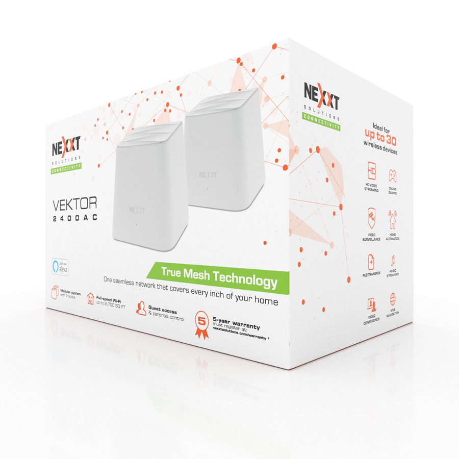 “Por su parte, los Vektor G2400-AC y Vektor 2400-AC ofrecen Wi-Fi de alta velocidad con una cobertura de hasta 250 m2, ayudando a eliminar puntos muertos y señales débiles. Con conexiones más fluidas a través de sus 2 nodos, a la par con la configuración de red única, es capaz de mantener al usuario y a su dispositivo conectado permanentemente a la señal más intensa, sin demoras ni interferencias de ningún tipo», explicó Erika Merlo. “Los Vektor G2400-AC y Vektor 2400-AC de Nexxt Solutions fueron diseñados para integrarse perfectamente al hogar y para una implementación flexible en lugares de difícil acceso, ya que solo requieren enchufar cada nodo a la red eléctrica. Además, son fáciles de configurar a través de la aplicación móvil Nexxt Wireless. Estos nodos inteligentes eligen la ruta más corta y rápida para crear una red de comunicación para todo el hogar que admite hasta 50 y 30 dispositivos –respectivamente–, conectados en forma simultánea. Las soluciones Mesh de Nexxt Solutions ofrecen una red única y estable para toda la familia. También cuentan con funcionalidades adicionales, como el Control Parental y la posibilidad de crear una red para invitados. Gracias a su capacidad y gran cobertura, permiten a los usuarios ver videos en 4K, escuchar música en alta calidad e implementar sistemas de automatización del hogar y cámaras de videovigilancia», concluyó.