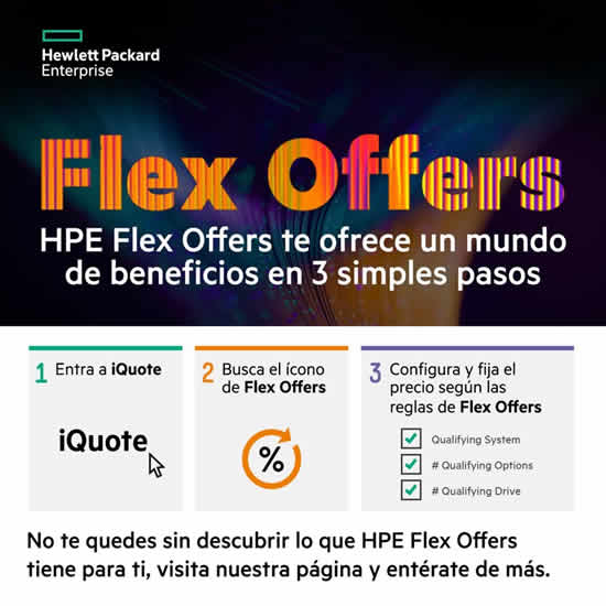 HPE FlexOffers está disponible a través de la plataforma iQuote y establece ciertos parámetros para hacer efectivas las promociones, que se suman a las que puedan estar vigentes de acuerdo a la cartera de productos. Es la misma plataforma la que indica las condiciones necesarias para acceder al descuento FlexOffers y los productos que aplican a este programa se encuentran identificados con un logotipo distintivo.