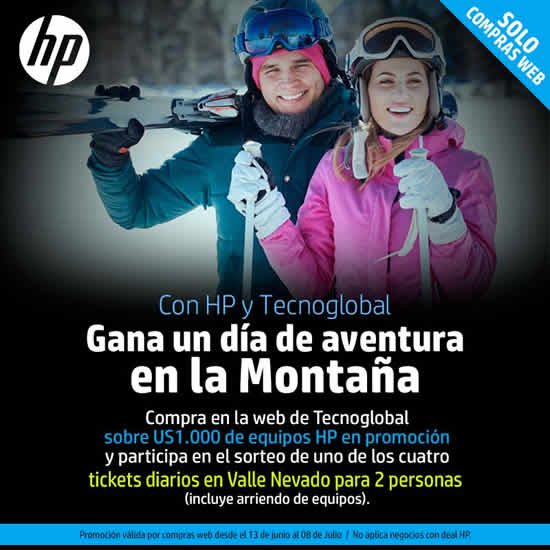 Por solo USD$1.000 en compras web de los más de 15 productos que Tecnoglobal y HP tienen en promoción, los clientes participan en el sorteo de uno de los cuatro tickets diarios para 2 personas en Valle Nevado, con arriendo de equipos incluido.