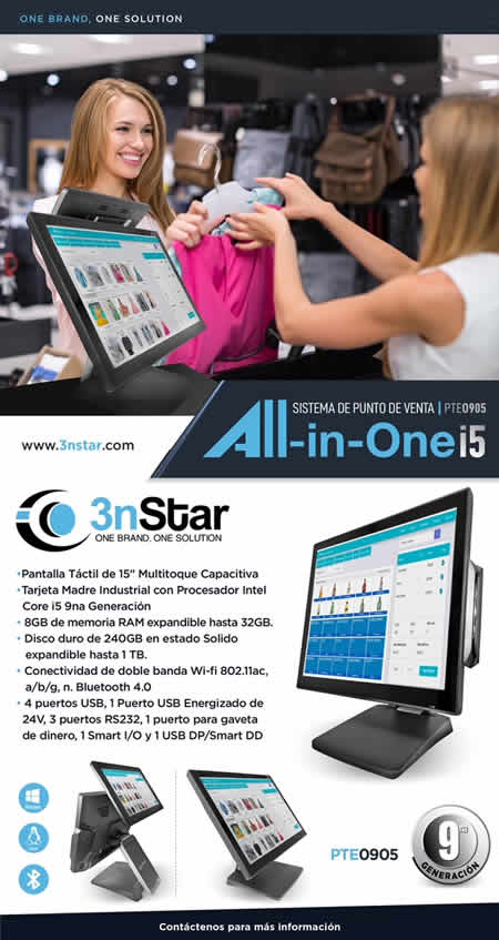 El PTE0905 All-In-One se suma a la gran familia de equipos de la marca 3nStar. Este sistema está diseñado para las aplicaciones más demandantes de punto de venta y hospitalidad.