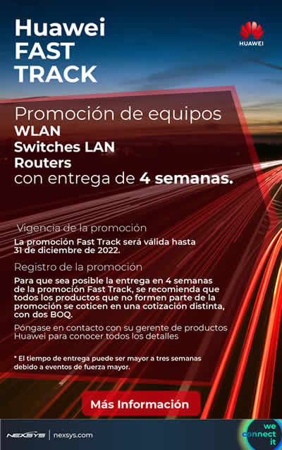 Nexsys sigue trabajando para ofrecer los mejores descuentos a sus clientes. En esta ocasión, el mayorista junto a Huawei traen para ti la promoción Fast Track, donde podrás llevar switches WLAN y routers LAN con entrega en 4 semanas, hasta el 31 de diciembre de 2022.