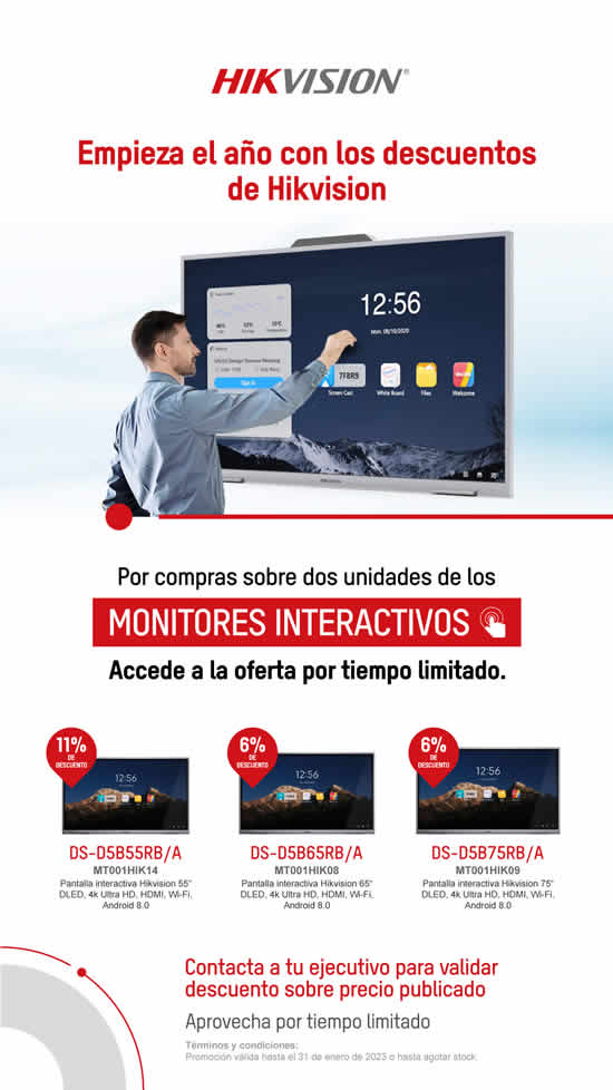 Hasta el 31 de enero o hasta agotar stock, por la compra de dos o más monitores interactivos Hikvision en la Webstore de Intcomex, los clientes obtendrán precios con descuento en los siguientes modelos: