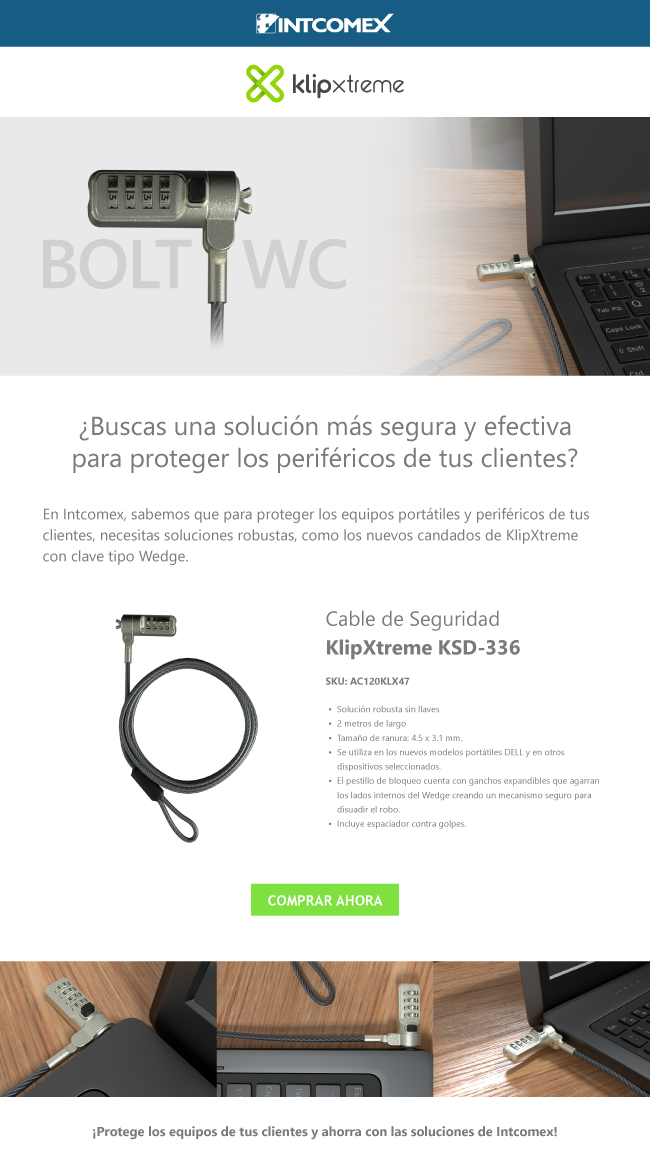 Para proteger los equipos portátiles y periféricos de tus clientes contra robos, Intcomex tiene la solución ideal. Se trata del nuevo cable de seguridad KlipXtreme KSD-336, diseñado con una clave tipo Wedge.