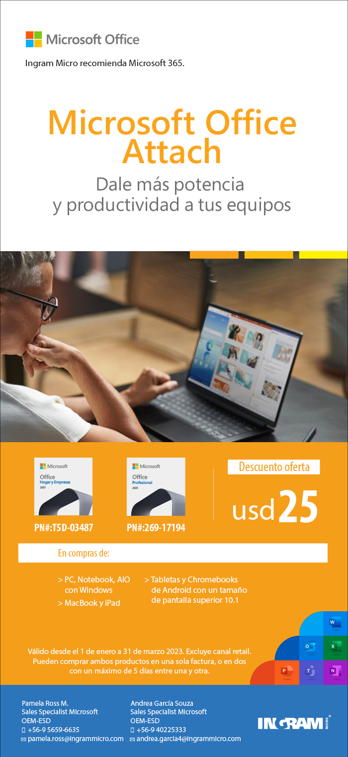 Por las compras de algunos de los siguientes productos a través del mayorista: PC, notebooks, AIO con Windows; Macbooks, iPad, Tablets, Chromebooks y dispositivos Android con una pantalla superior a 10.1, accede a un descuento de hasta US$ 25 por unidad en las licencias de Microsoft Office Hogar y Empresas 2021 y/o Microsoft Office Profesional 2021.