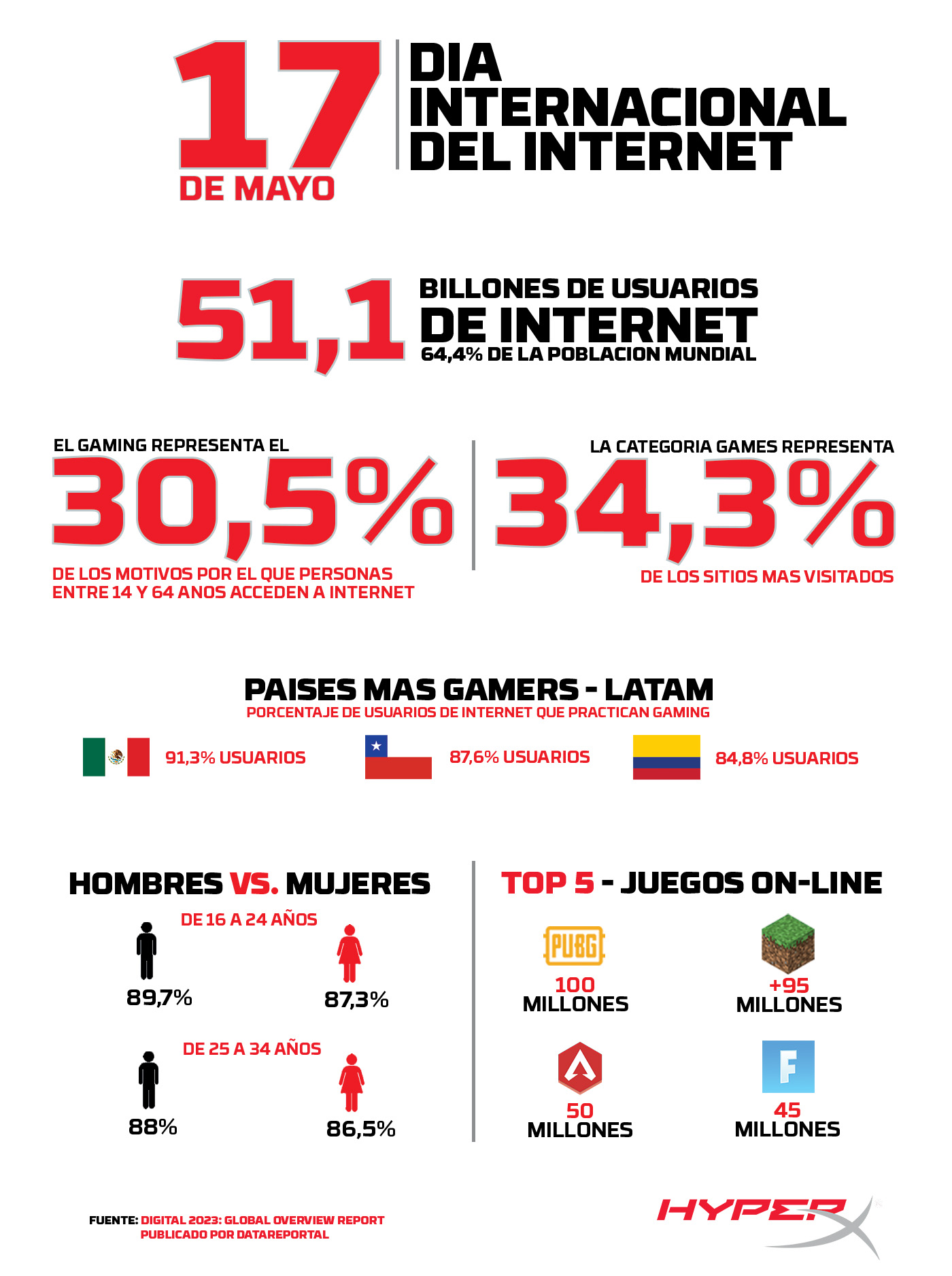 HyperX, el equipo de periféricos para videojuegos de HP Inc. y la marca líder en videojuegos y esports, celebró el pasado Día internacional del internet con algunos datos relevantes sobre cómo internet contribuye a la expansión y crecimiento del gaming en todos los rincones del mundo para que cada vez sean más personas quienes puedan disfrutar de este entretenimiento.