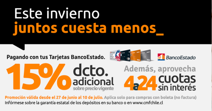 Para hacer válida la promoción se debe mencionar la campaña al momento de pagar en tiendas presenciales o ingresando los primeros 6 dígitos de la tarjeta en la página web, a través del botón de pago BancoEstado. Además, los clientes pueden acceder a opciones de pago desde 4 a 24 cuotas sin interés. Las promociones son sujetas a disponibilidad de stock. Adicionalmente los clientes que paguen con tarjeta de crédito pueden optar hasta 24 cuotas SIN INTERÉS.