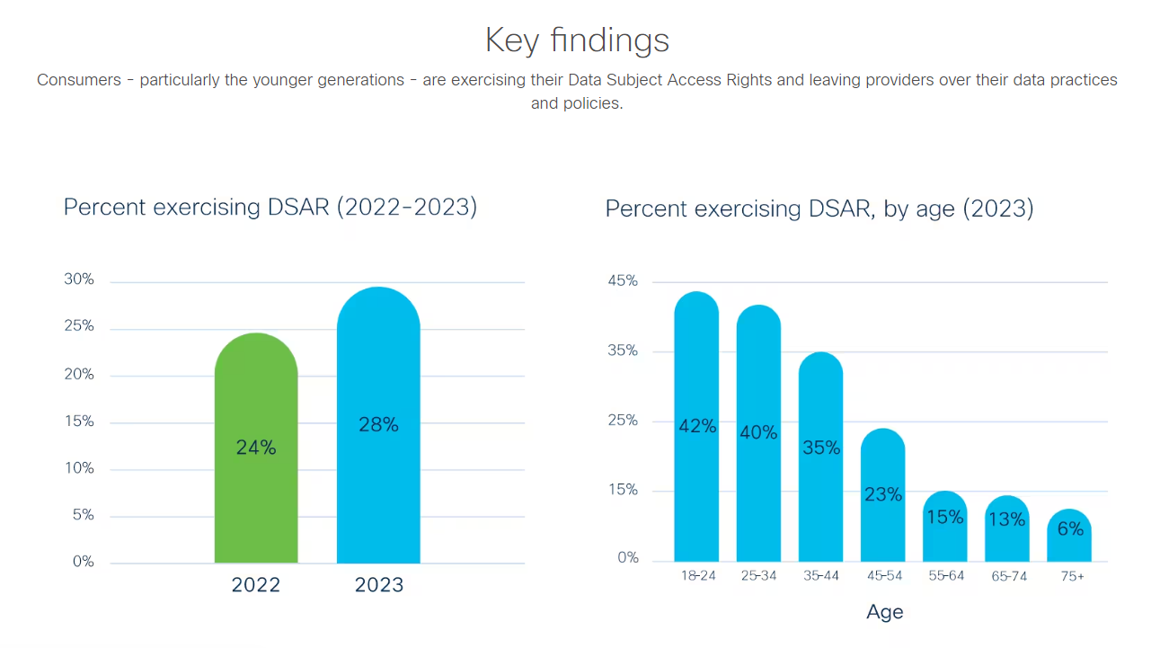 Uno de los primeros resultados del informe fue que la mayoría de las personas (90% de los encuestados) mostró preocupación por su privacidad y quiere tener más control de cómo se manejan sus datos. En el mismo sentido, un 81% están dispuestos a tomar acción y son capaces de cambiar de un proveedor de servicios a otro si no están satisfechos en cómo se maneja la privacidad de sus datos.