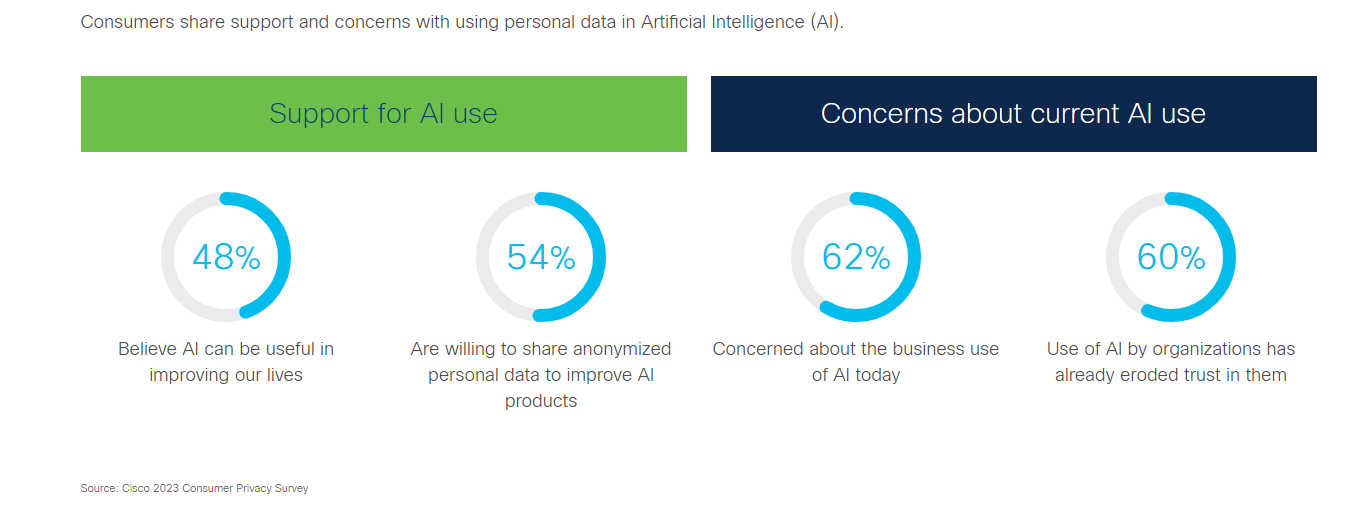 Sin embargo, el 62% de los consumidores encuestados expresó preocupación por cómo las compañías utilizan sus datos personales para la IA en la actualidad, y el 60% dijo que ya perdió la confianza en las organizaciones debido a su uso de la IA.