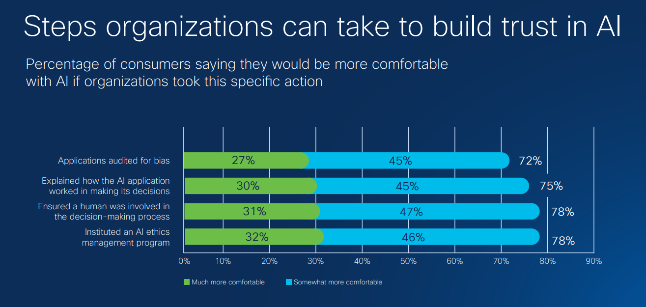 Las organizaciones pueden implementar medidas para ganar o recuperar la confianza de los clientes, como auditar productos y soluciones para detectar sesgos, ser más transparentes y explicar cómo funciona la IA, garantizar la participación humana e instituir un Programa de Gestión Ética de la IA.